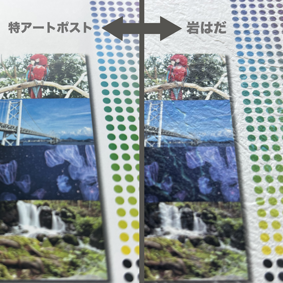 鏡面のキャストコート紙、光沢が強く印刷再現性も優れ高級感を演出します。 裏面はアートポストになります。